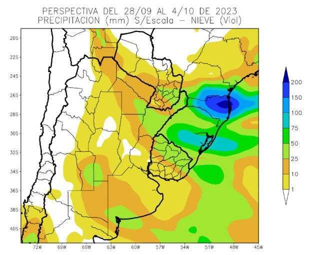 Tras el ingreso de una entrada de aire polar, se espera que posteriormente se desarrolle un frente de tormenta con actividad muy irregular, que producirá un foco de lluvias moderadas a abundantes sobre el sudoeste del área agrícola, y otro foco con registros moderados a abundantes sobre el nordeste. Por el contrario, la mayor parte del oeste y el centro recibirá aportes escasos a nulos.