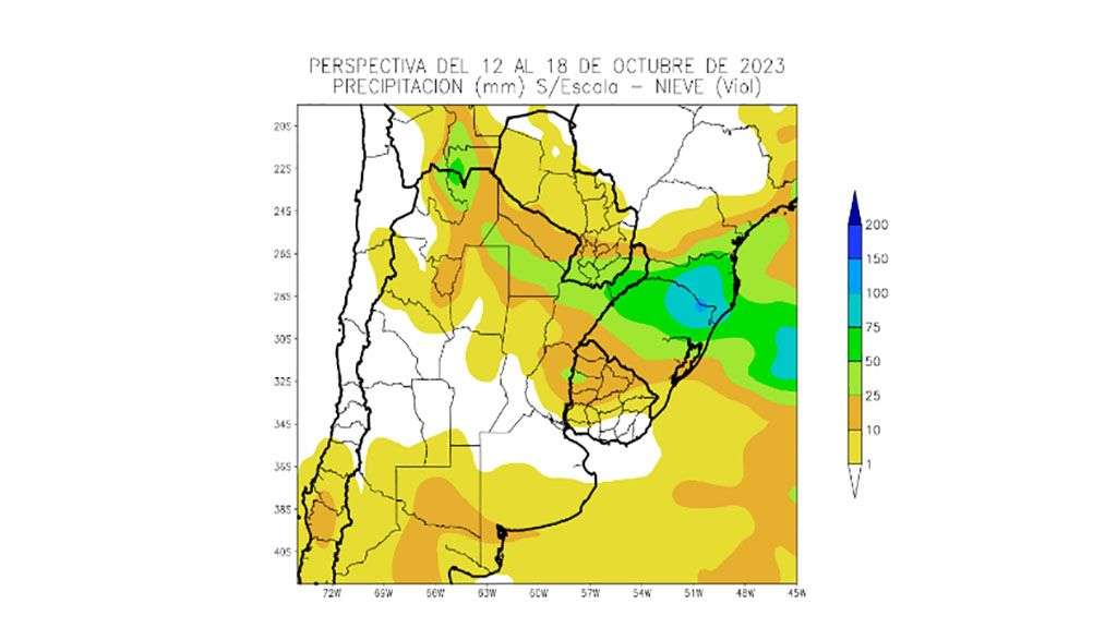 Es así que las perspectivas climáticas esperan que el norte del NOA, la Región del Chaco, la mayor parte de la Mesopotamia, el sur de La Pampa y el sur de Buenos Aires observen precipitaciones entre moderada y abundantes (10 a 50 mm) con focos de valores superiores a 100 mm que se ubicarán sobre el sur de Misiones y el nordeste de Corrientes. El resto del área agrícola recibirá aportes hídricos escasos a nulos con focos con valores moderados