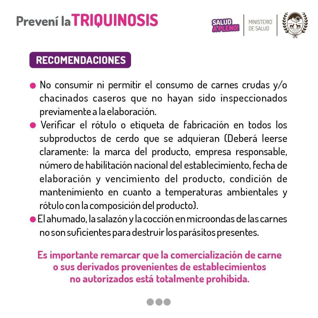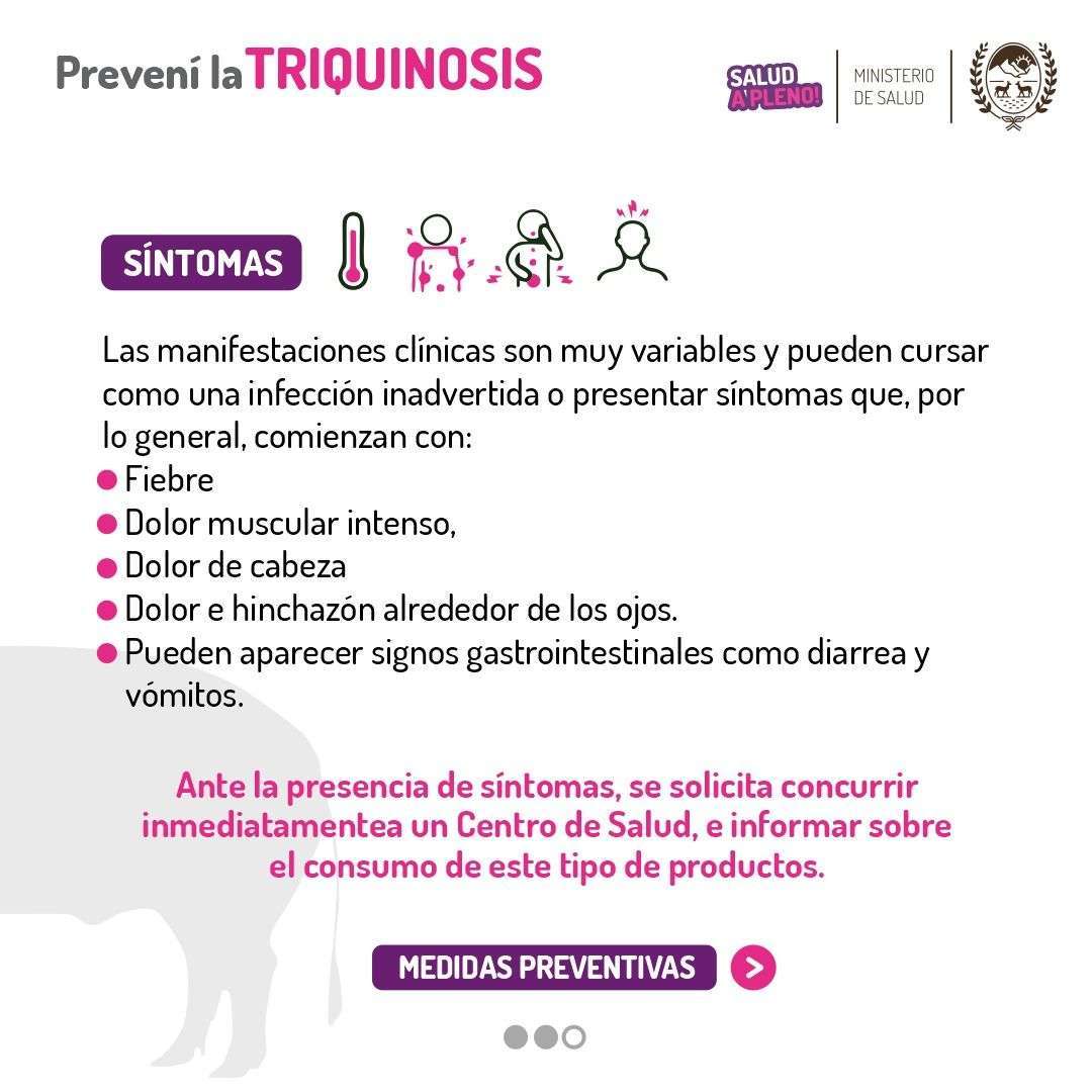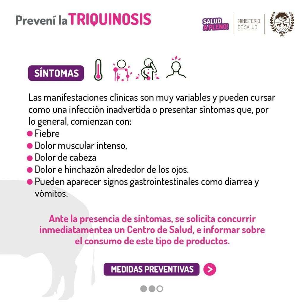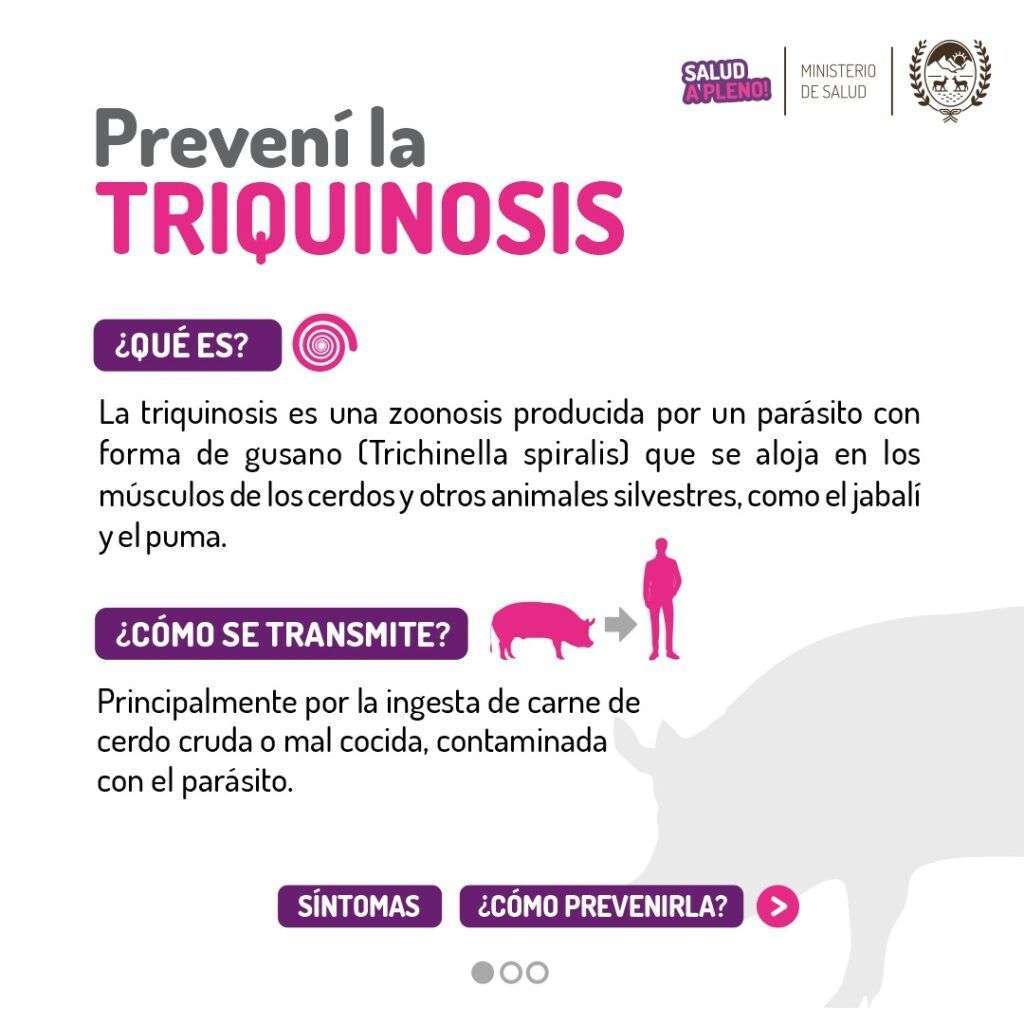 El Programa de Epidemiología a través del Servicio de Zoonosis, informó acerca de un brote de triquinosis en el departamento Junín, en las localidades de Bajo de Véliz y Santa Rosa del Conlara. Los cinco casos reportados hasta el momento son todos oriundos de esas localidades.