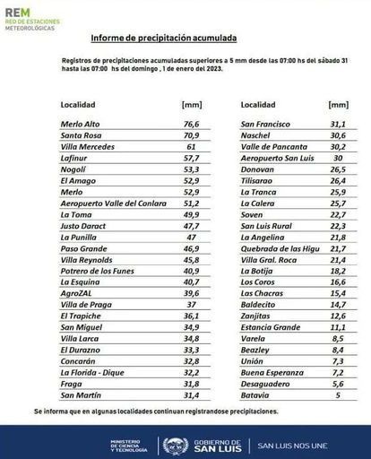 En esta fracción del Departamento Belgrano junto a Merlo, Santa Rosa del Conlara, Lafinur y Villa Mercedes encabezaron la tabla de mayores precipitaciones, según marcó la Red de Estaciones Meteorológicas de la provincia.