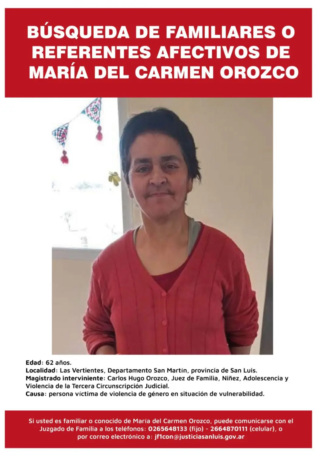 «Si usted es familiar o conocido de María del Carmen Orozco, puede comunicarse al Juzgado de Familia a los teléfonos: 0265648133 (fijo) o 2664870111 (celular). También puede enviar un correo electrónico a: [email protected]«, precisó la oficina de prensa del Poder Judicial.