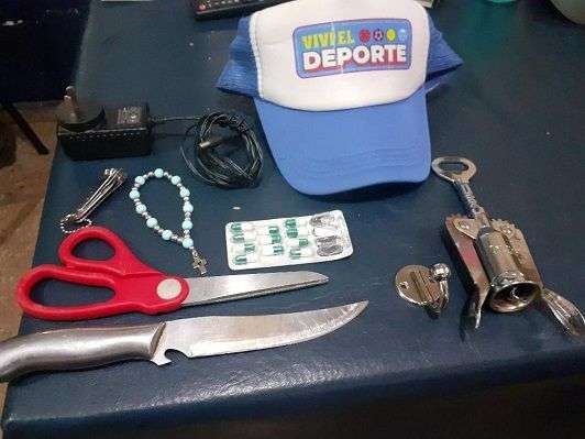 Al revisar sus pertenencias ante testigos observaron que en una mochila que transportaba una (01) teca de bronce 15 cm, una teca guarda hostias, un pie de bronce para Copa con crucifico, un porta hostias de bronce con inscripción JHC, Una cuchara de plata de 6 cm, (11) pastillas de omeprazol de 20 mg, un denario tipo pulsera plásticos color celeste y la suma de doscientos setenta pesos de denominación argentina.