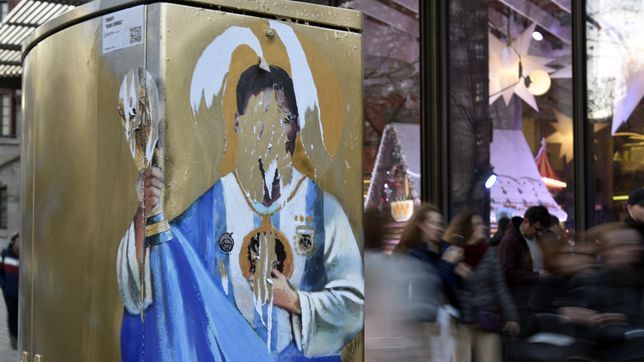Un mural de Lionel Messi posando con la Copa obtenida en el reciente Mundial de Qatar 2022 y vestido como un santo, obra del artista urbano Tvboy en la avenida Diagonal de Barcelona, España, apareció este viernes vandalizado.