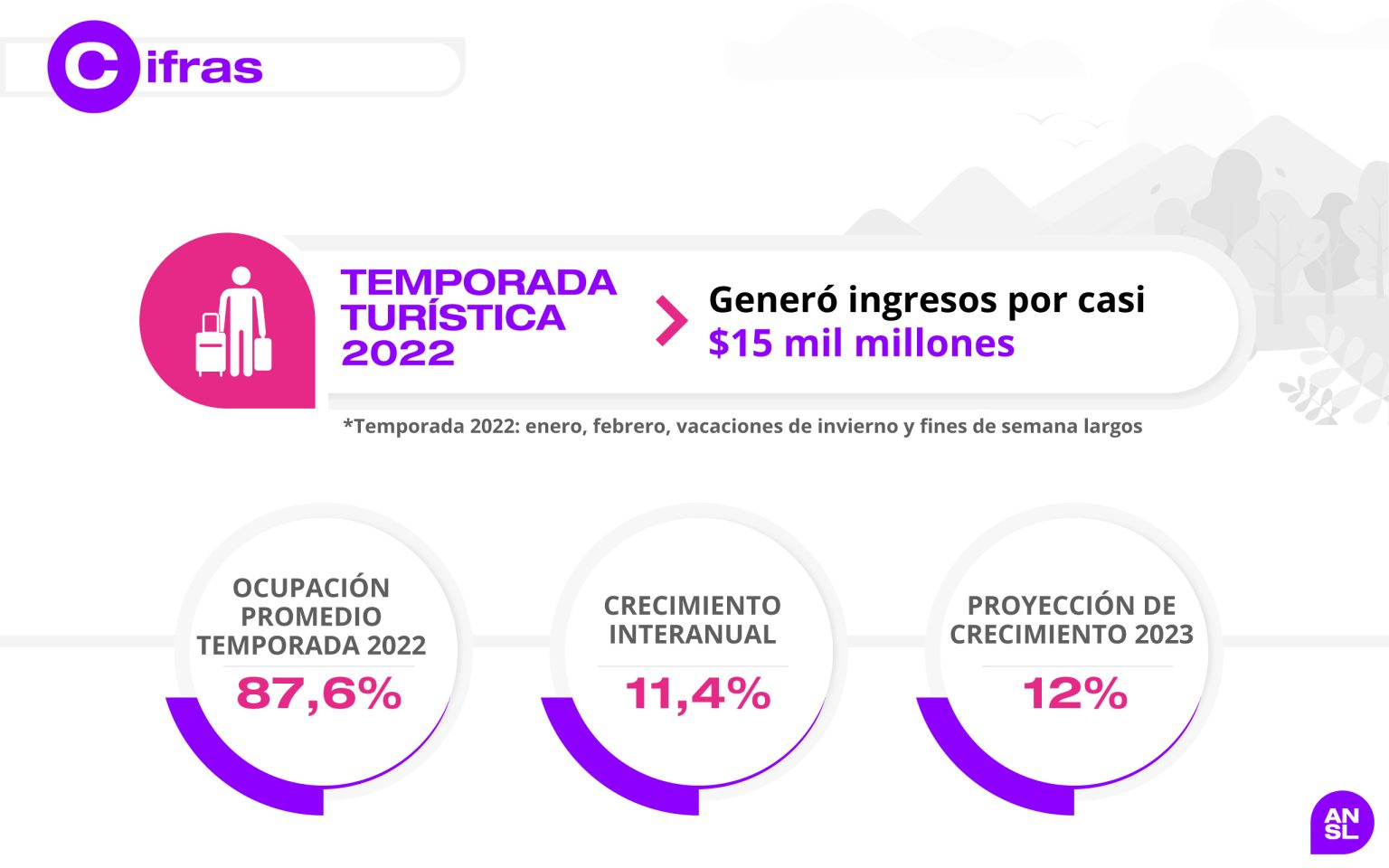 La temporada 2022 (enero- febrero), vacaciones de invierno y fines de semana largos, generó ingresos por $14.700 millones, con una ocupación del 87,6% y un crecimiento interanual del 11,4%, que para 2023 será del 12%, según las optimistas proyecciones oficiales.