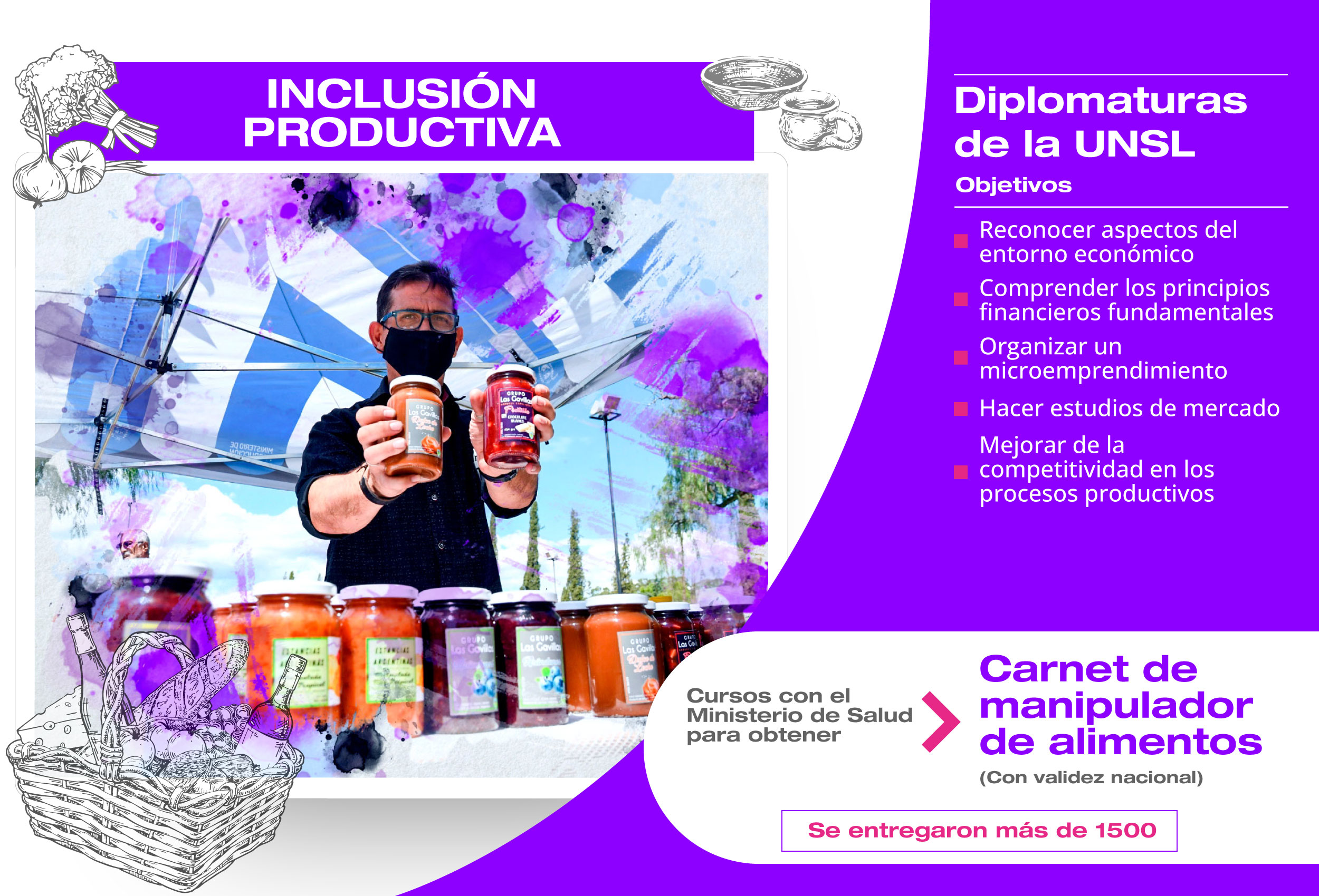Por ello, se impulsó junto a la Universidad Nacional de San Luis la diplomatura en emprendedurismo que tiene como objetivo promover la formación de pequeños y medianos productores buscando favorecer su inclusión socio-productiva mediante el trabajo genuino. El objetivo es brindarles herramientas que permitan potenciar sus emprendimientos. Reconocer aspectos del entorno económico, comprender los principios financieros fundamentales, generar herramientas para organizar un microemprendimiento, hacer estudios de mercado, mejorar la competitividad en los procesos productivos, son algunos de los temas que se enseñan. En esta primera cohorte se inscribieron 700 participantes.