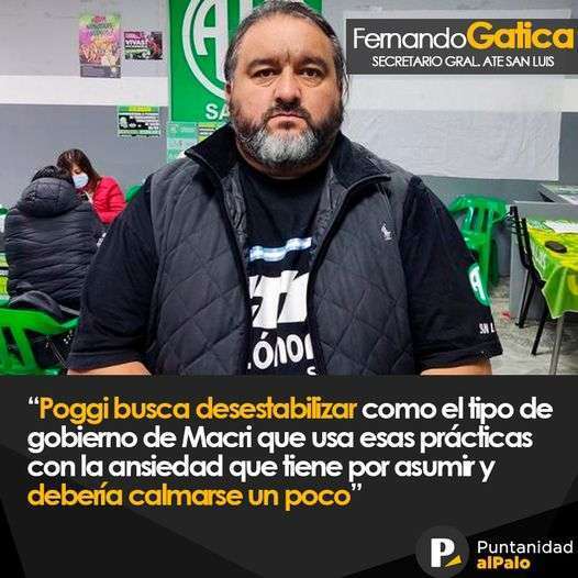 Gatica criticó también que el gobernador electo que asumirá en diciembre, Claudio Poggi. realizó declaraciones en las “que quiere instalar que están peligrando los salarios y el aguinaldo, cuando es una barbaridad y bajo ningún punto de vista nosotros lo vamos a aceptar porque en San Luis nunca fue un problema el cobro de aumentos o el miedo de cobrar el salario”.