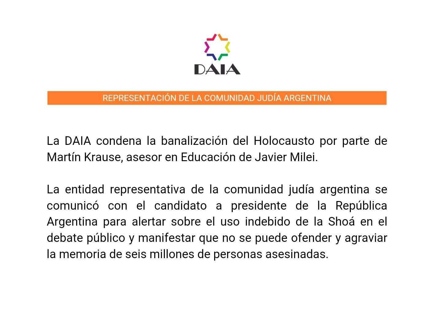 Al conocerse las repudiables expresiones de Krause, la DAIA emitió un comunicado al respecto: “La DAIA condena la banalización del Holocausto por parte de Martín Krause, asesor en Educación de Javier Milei. La entidad representativa de la comunidad judía argentina se comunicó con el candidato a presidente de la República Argentina para alertar sobre el uso indebido de la Shoá en el debate público y manifestar que no se puede ofender y agraviar la memoria de seis millones de personas asesinadas”.