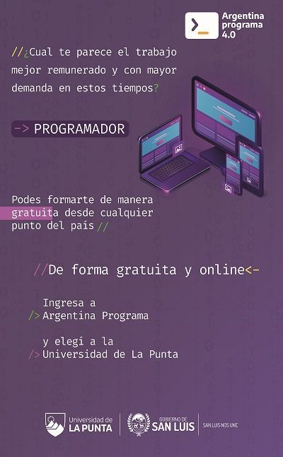LLa formación de recursos humanos en herramientas digitales, y en particular en desarrollo de software es una de las prioridades que ha mantenido el Gobierno de San Luis, a través de la Universidad de La Punta, durante los últimos años con el convencimiento que el sector tecnológico es una de las áreas estratégicas en el desarrollo productivo, que una alta demanda laboral y sueldos a nivel internacional. La experiencia adquirida y los resultados obtenidos durante los últimos años, han sido reconocidos por Nación que sumó a la Universidad de La Punta para ser parte del Plan Nacional Argentina Programa 4.0, que capacitará a 70 mil argentinas y argentinos en el desarrollo de software para promover la inserción laboral en el sector IT.