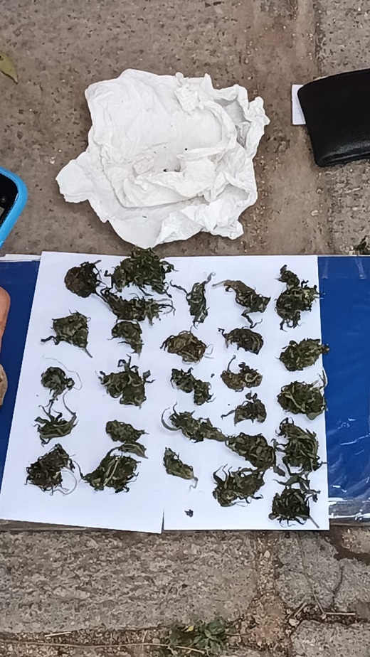 Resultó tener 26 años y al ser requisado (palpado superficial), se le encontró entre sus prendas de vestir un envoltorio con Cannabis Sativa y cigarrillos armados de marihuana quemados.