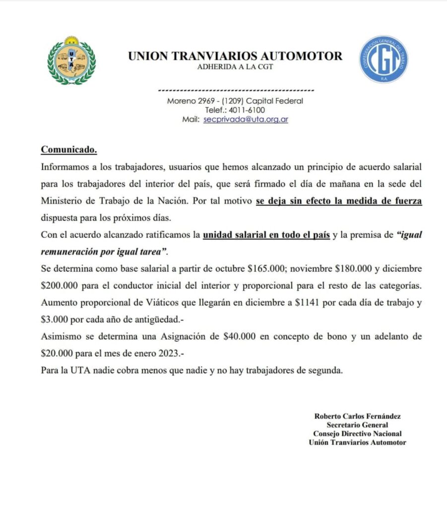 Lo informó a la prensa Iván Piñeiro, secretario general de la UTA. Dijo que al avanzar las negociaciones salariales a nivel nacional, se cancelaba el cese de actividades por 72 horas que se había previsto para este martes, miércoles y jueves. Luego, la organización gremial emitió un comunicado de prensa.