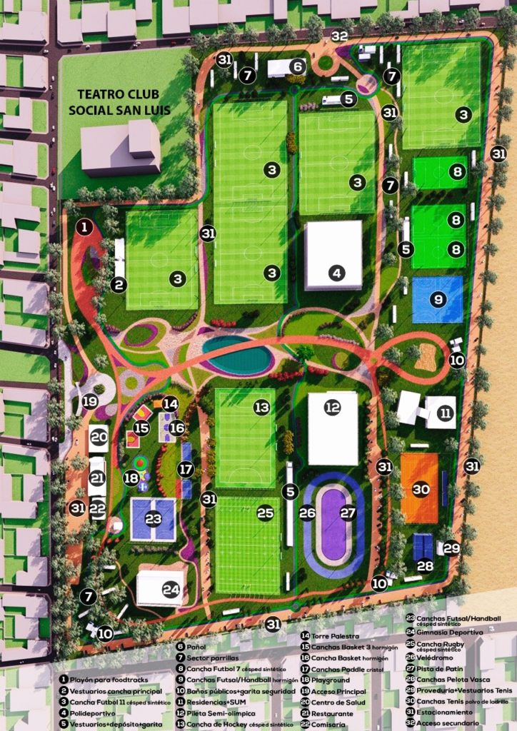 Con una extensión de 27 hectáreas, el lugar se convertirá en uno de los principales puntos de encuentro para la familia en la ciudad de San Luis. Contará con espacios para la práctica de diferentes disciplinas deportivas y para el esparcimiento de personas de todas las edades.