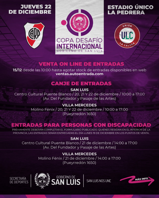 La venta online comenzará a las 10:00 por la web de Auto Entrada. La venta presencial será a partir del lunes en 12 ciudades y localidades de la provincia. El partido se disputará el jueves 22 de diciembre, a las 21:15, en el Estadio Único La Pedrera.