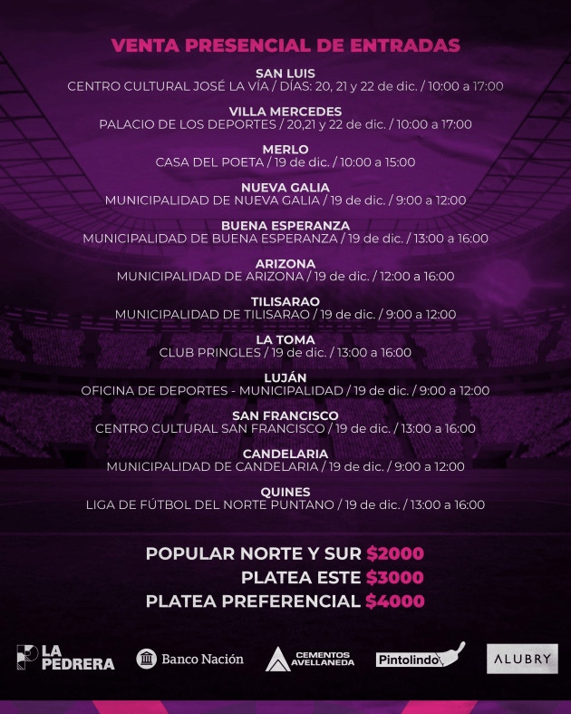 Quienes prefieran comprar sus tickets en efectivo y por boletería, podrán hacerlo el lunes en Merlo, Nueva Galia, Buena Esperanza, Arizona, Tilisarao, La Toma, Luján, San Francisco del Monte de Oro, Candelaria y Quines.