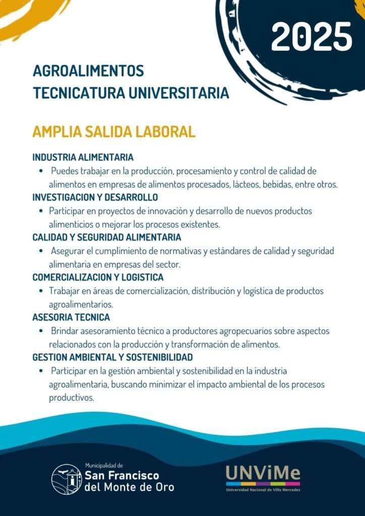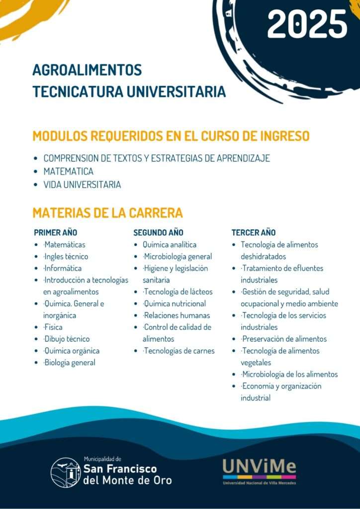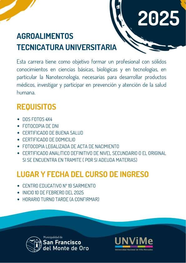 A través de una acción conjunta de la Universidad Nacional de Villa Mercedes (UnViMe) y la Municipalidad de San Francisco del Monte de Oro, ahora los vecinos de la región podrán estudiar la Tecnicatura Universitaria en Agroalimentos.