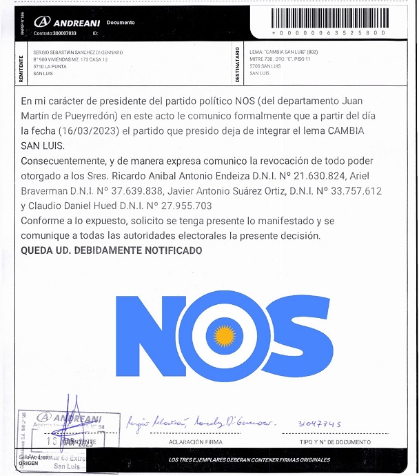 Al alejamiento del partido Nos, que tiene como caras más visibles a los dirigentes Martín Olivera y Sebastián Sánchez Di Gennaro (presidente), este jueves se sumaron otros dos indignados por el acuerdo de Claudio Poggi con Adolfo Rodríguez Saá.