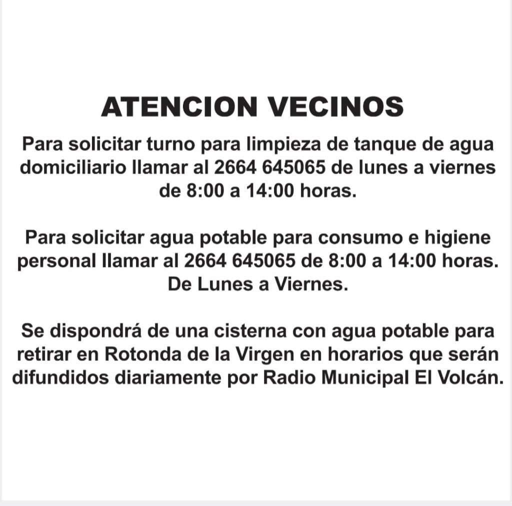 -Para ello se están disponiendo las medidas para contar con distribución de agua potable, desde la planta potabilizadora de Juana Koslay, difusión correspondiente y limpieza de tanques.