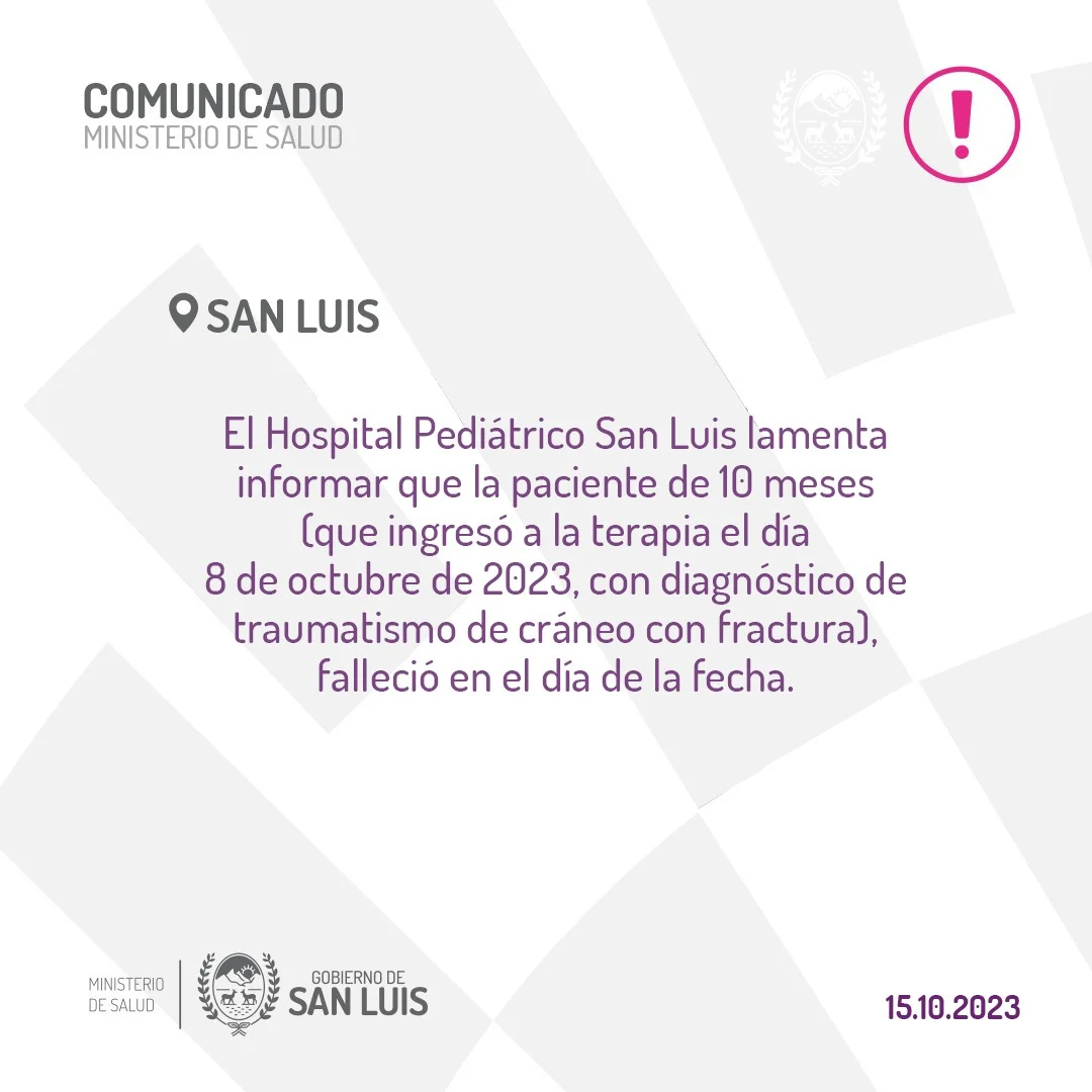 Hoy, a la tarde, falleció la bebé de 9 meses que se encontraba en el Hospital de Pediatría como consecuencia de las gravísimas lesiones que sufrió en la cabeza, en un confuso hecho que ocurrió hace unos días en el barrio 208 Viviendas o Justo Daract de San Luis.